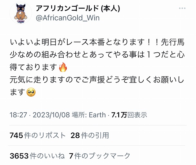 10時休憩中にアフリカンゴールドのリプを見て知りましたわ。